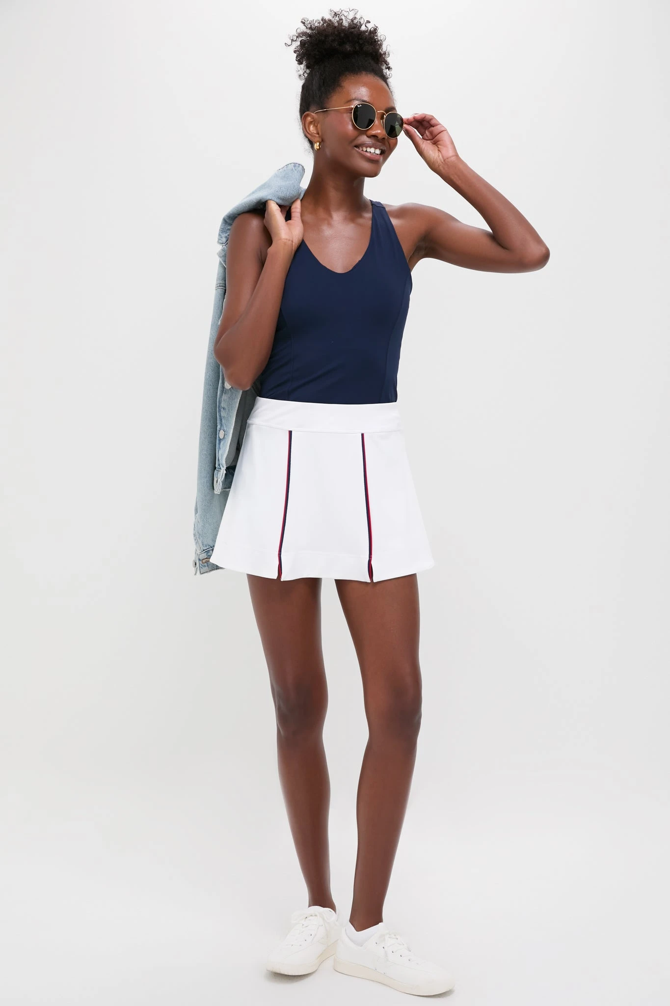 The Americana Piped 13 Inch Willis Tennis Skirt is a chic new style in a shorter length for a flattering fit. This skirt features contrast piping along the front seams, as well as compression undershorts, for a fashionable look on and off the courts.