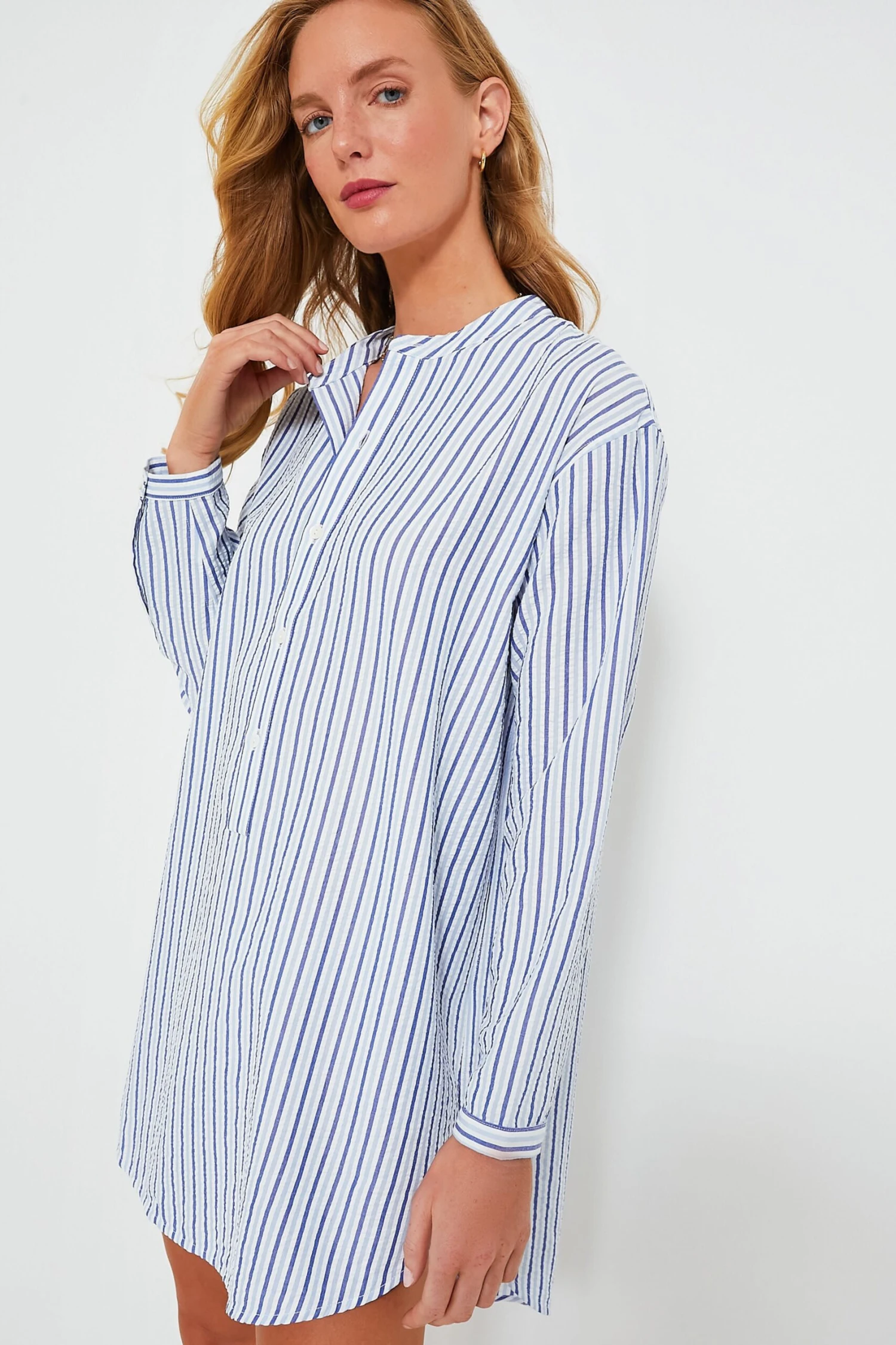The Baltic Stripe Seersucker Bodie Shirt Dress takes your favorite button-down and makes it into an adorable, easy mini dress. This style features a mandarin collar, shirttail hem, and blue striped seersucker fabric. Pair with sneakers and a crossbody for casual weekends, or with sandals and a tote for brunches and lunch dates.Â