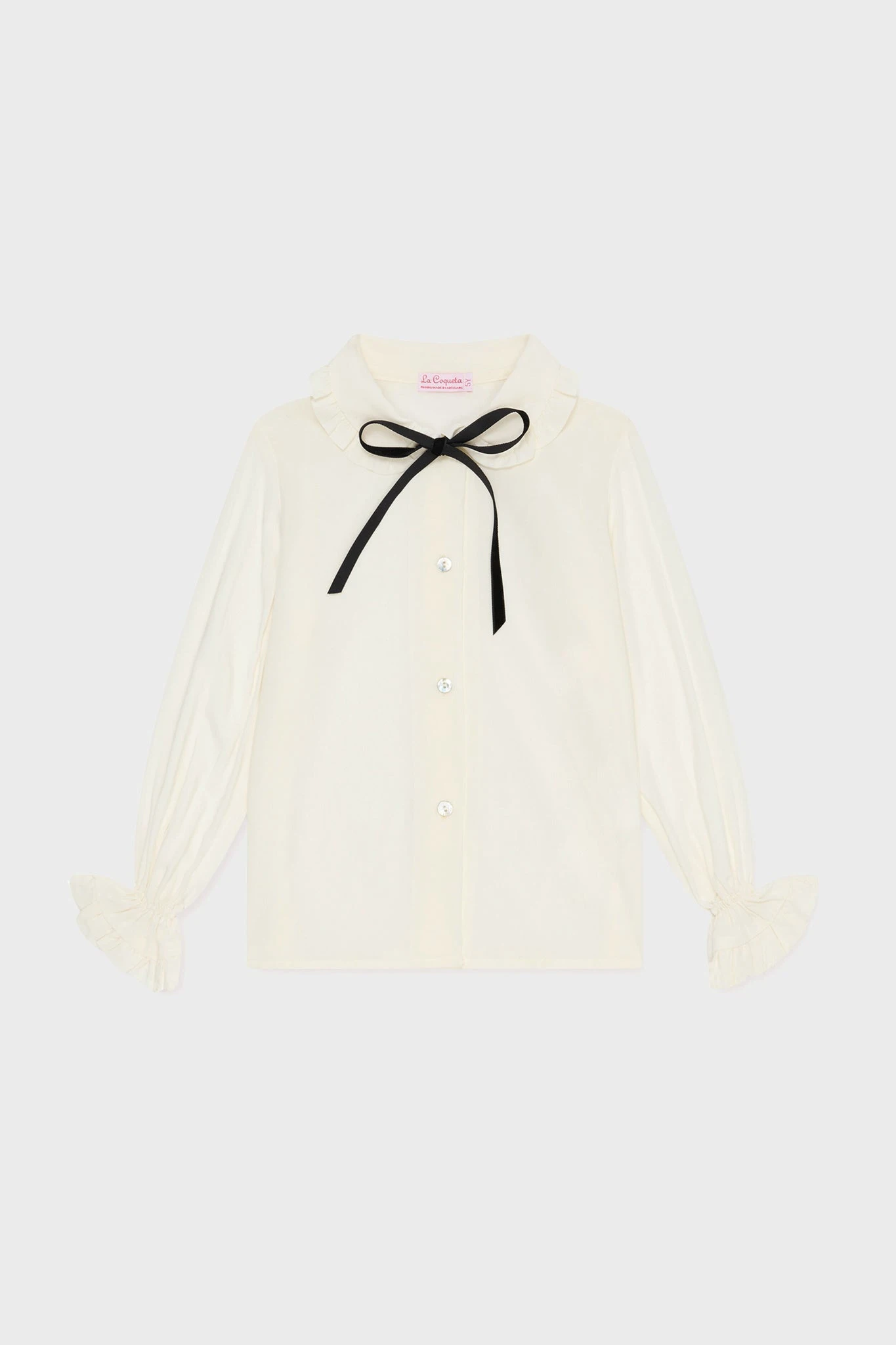Crafted from viscose, this relaxed, floaty Betty Shirt features adorable details including long blouson sleeves, ruffled cuffs, frilled peter pan collar, and a mother of pearl placket. Completed with a sweet self-tie velvet bow, it is perfect for both casual and dressy occasions. Wear with jeans for a relaxed look or with a skirt for a more polished ensemble, this chic top is sure to become her favorite.
