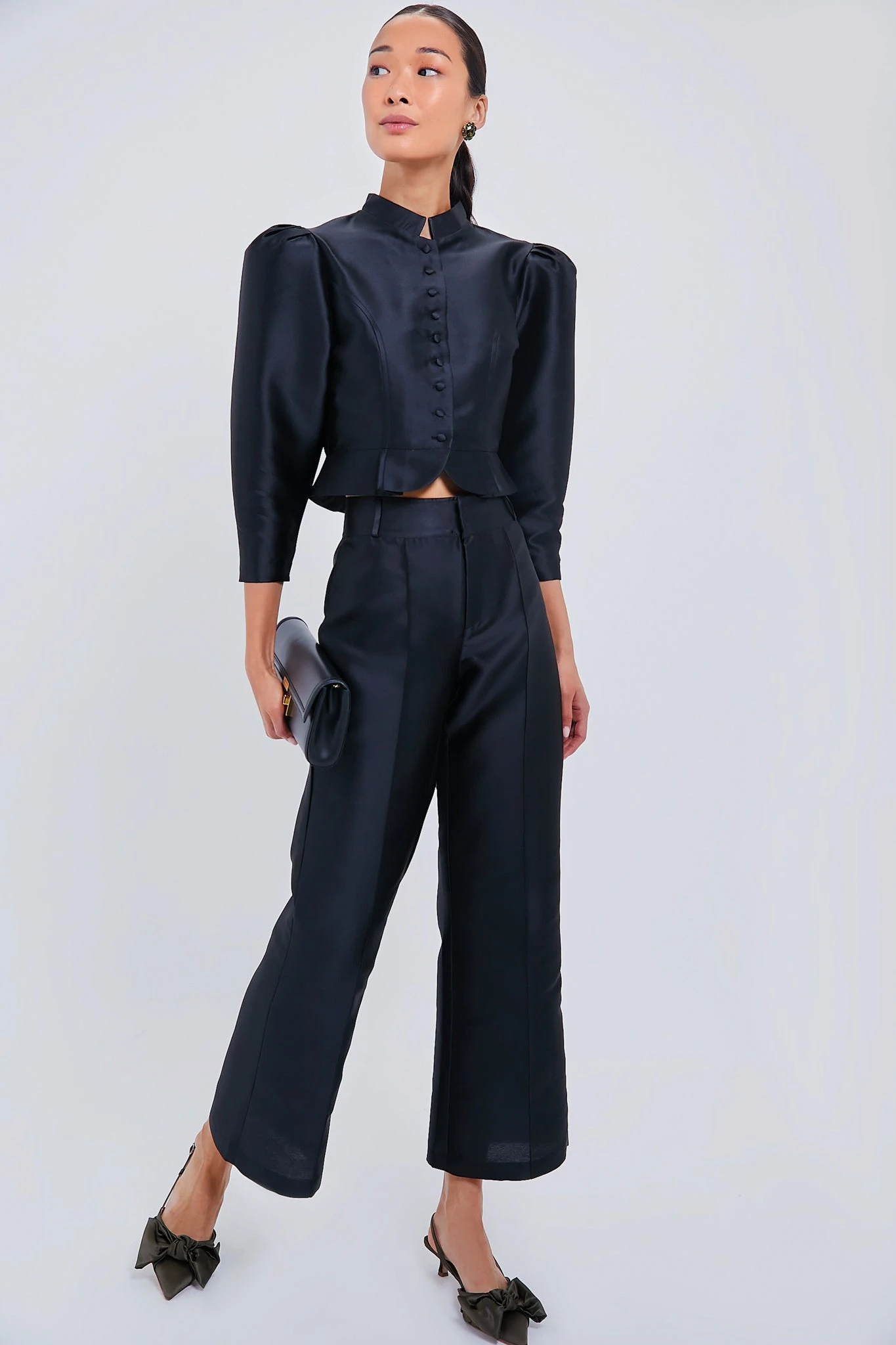 The Black Amoako Smart Jacket is distinguished by its impeccable vintage-inspired cut and a well-defined silhouette. Featuring a satin like finish, puff three-quarter length sleeves, and a peplum hem, this number guarantees to garner you a compliment or two! Style with the Black Yoshitomo Smart Pants as a set to wear at a party or pair with a skirt for any formal occasion coming up.Â