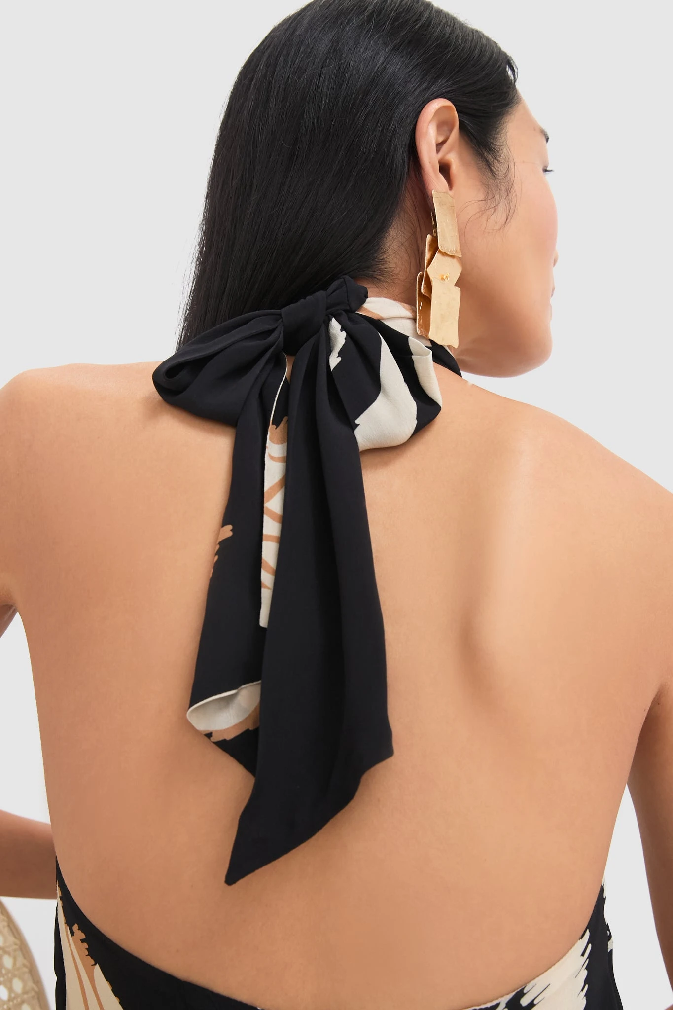 Crafted from lightweight crêpe de chine, this dress features a high neckline that contrasts beautifully with its open back for a bold, refined silhouette. A tie at the neck and a concealed back zipper ensure a secure, flattering fit. Just add heels, a clutch, and gold jewelry for a picture perfect look.