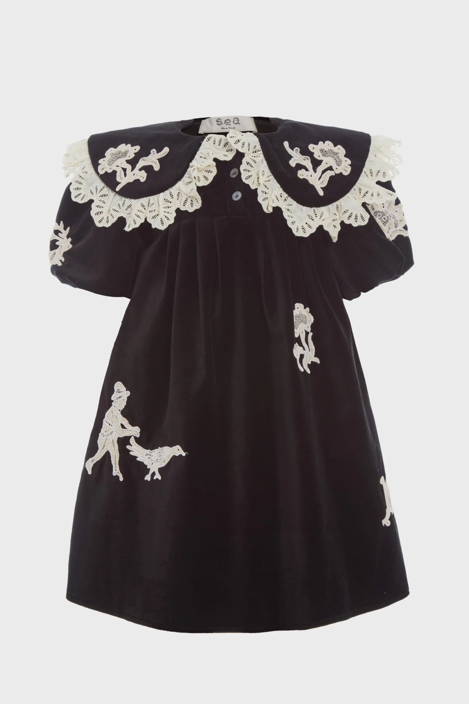 The Mika kids applique dress is full of whimsical charm, featuring delicate lace applique motifs on velveteen fabric, an oversized collar with delicate lace trim, and short puff sleeves. A sweet silhouette perfect for special moments. Â