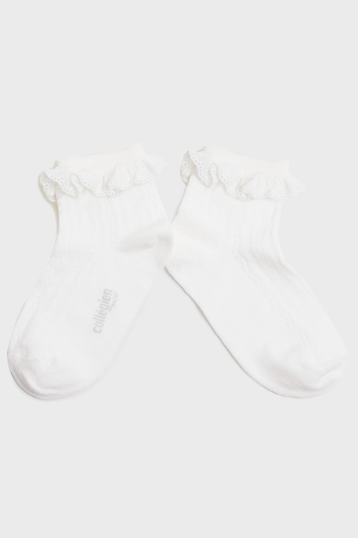 The Blanc Neige Marie-Antoinette Socks – a cozy and stylish essential for your little fashionista. Sustainably made from super-soft long-staple Egyptian cotton blended with some man-made fibers for stretch and fit, they feature a Broderie Anglaise ruffle at the ankle, adding a whimsical touch to any outfit. Pair them with Mary Janes or sneakers, they surely elevate everyday looks of your kiddo. Â