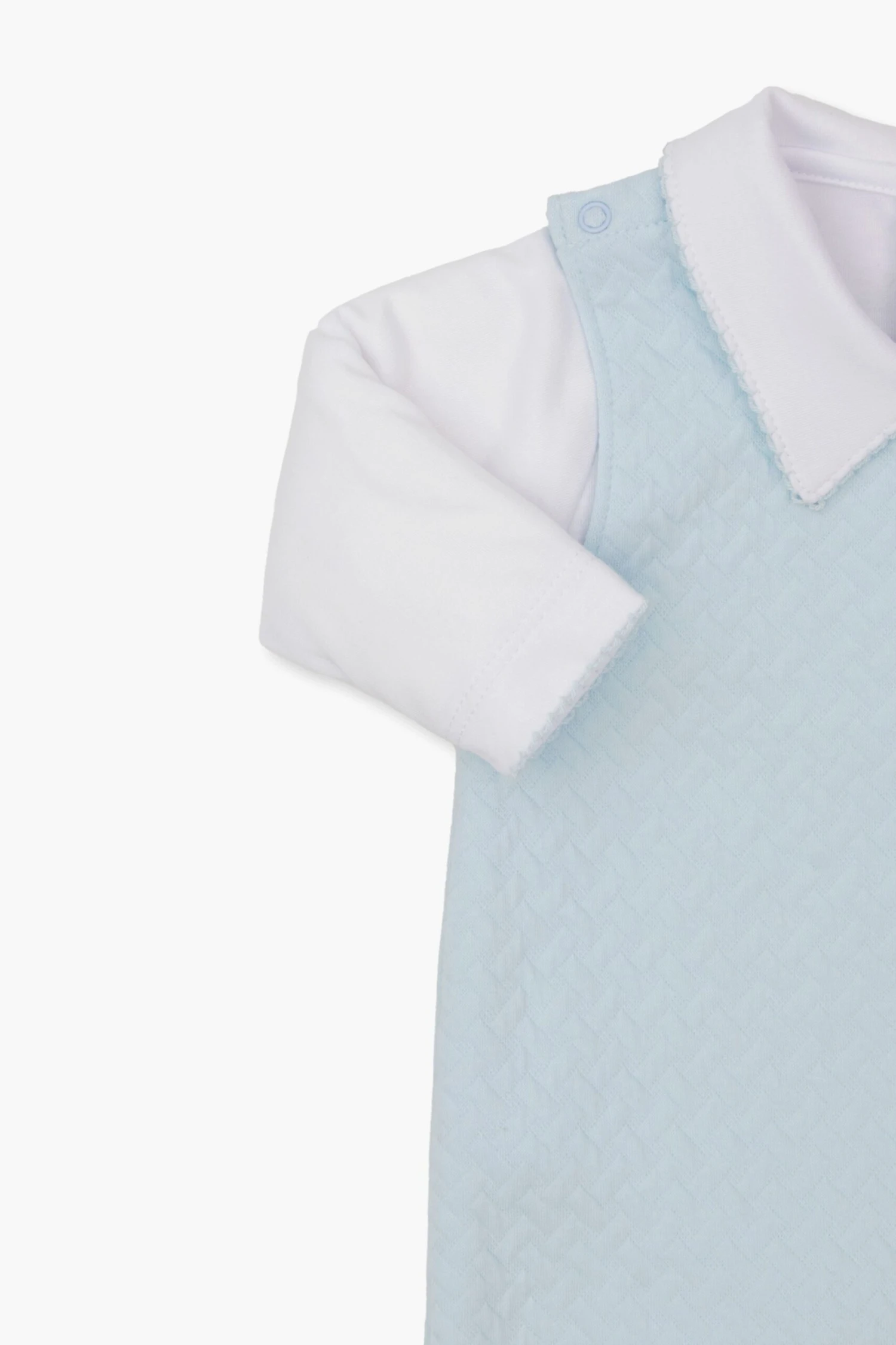 The perfect addition to your baby’s wardrobe, the Blue and White Jacquard Overall Set is all kinds of adorable. Made to feel oh-so-comfortable against your little one’s skin thanks to that lovely pima cotton, this two piece style features an inner onesie with a collar and long sleeves, and an outer sleeveless quilted layer — with plenty of snap closures throughout to make changing easy! Rest assured that your kiddo is cozy and comfy whenever this style is in the rotation.