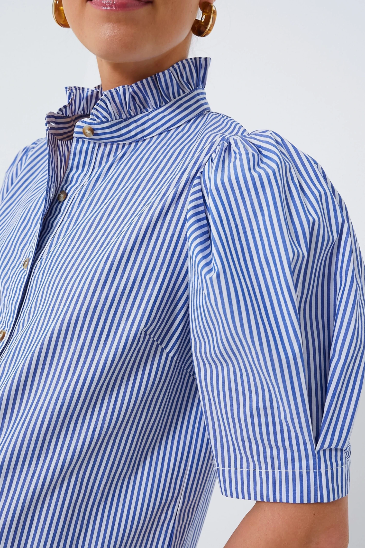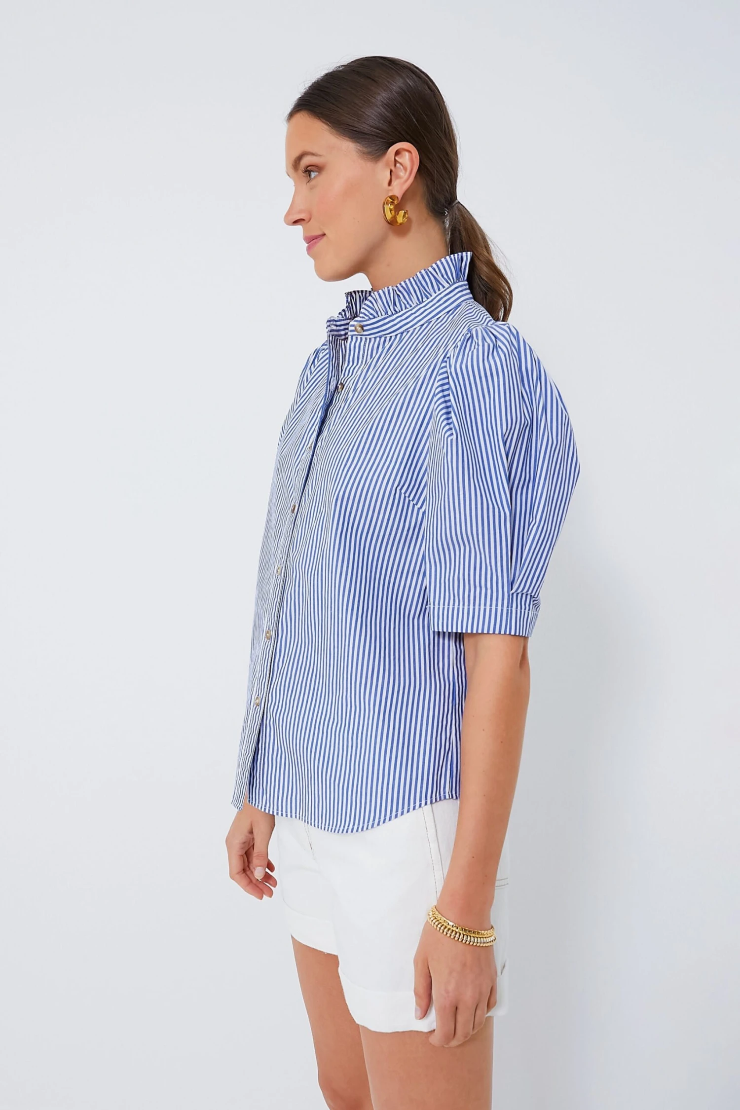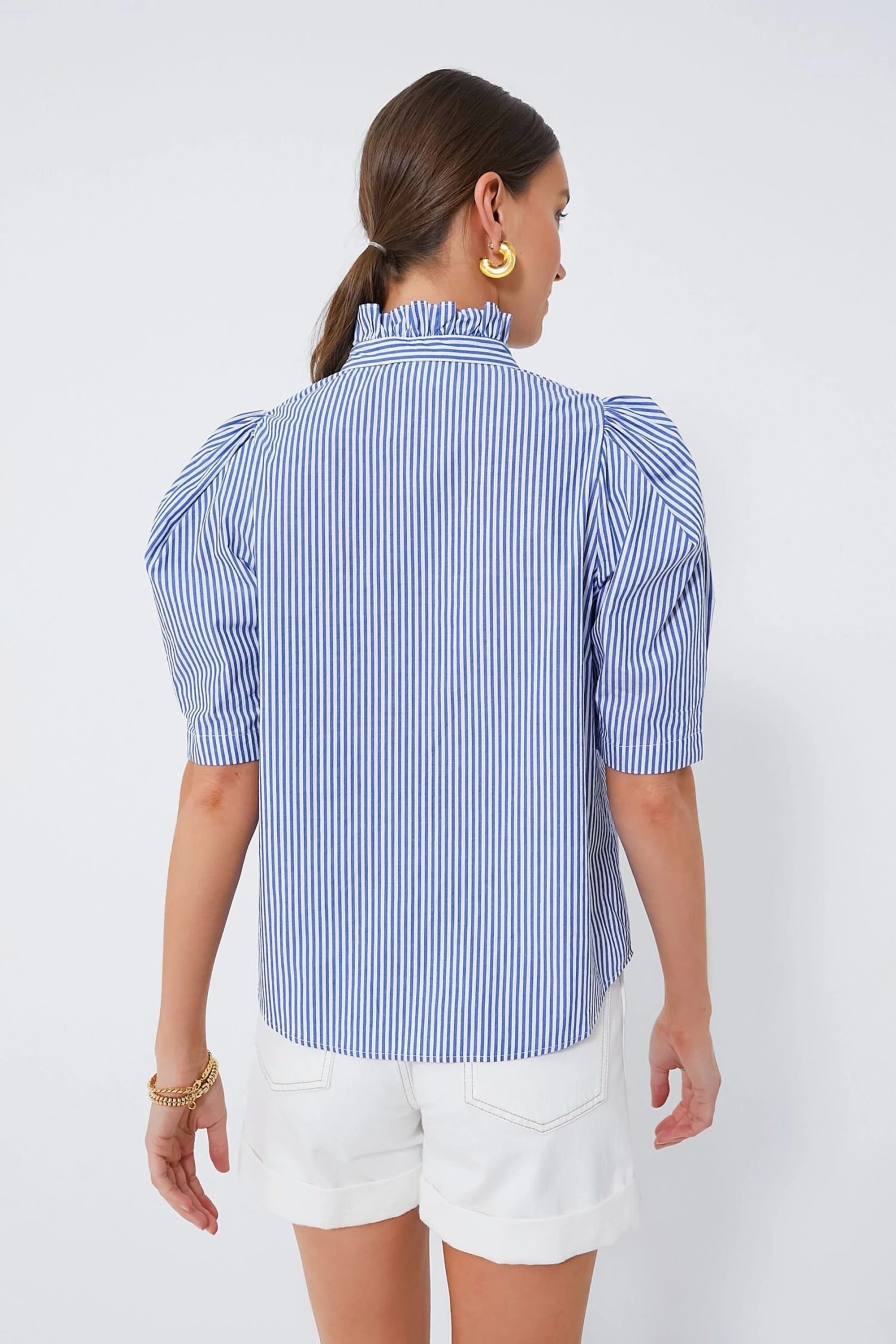 The Alicia Blouse is defined by it’s puff sleeves, ruffled stand collar, and always on-trend blue and white stripes. Cut in the perfect length that looks great tucked in or left out, this effortlessly polished piece is great for year round wear thanks to its versatile styling options. Pair this feminine number with white denim during the warmer months and opt for trousers and a sweater layered on top for the cooler ones.Â