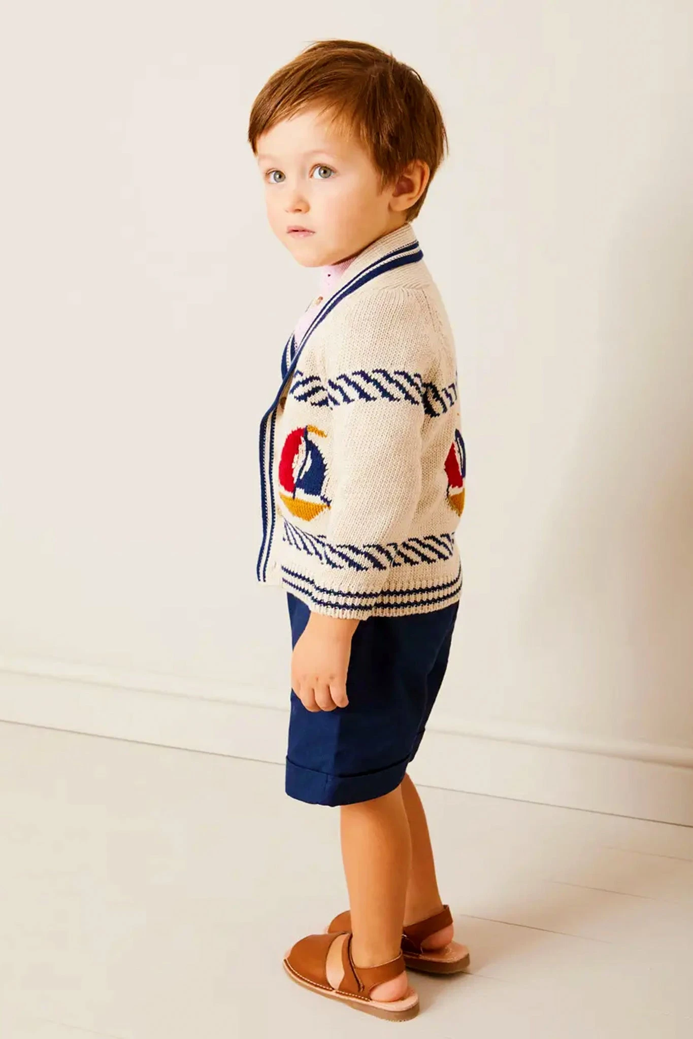 The beige Boat Cardigan combines timeless nautical charm with a cosy design, crafted from 100% cotton for comfort. Featuring a playful boat motif, this cardigan is perfect for little explorers who love adventures by the sea. With its versatile beige hue and classic nautical appeal, it brings a touch of coastal whimsy to everyday outfits, making it an essential layering piece.