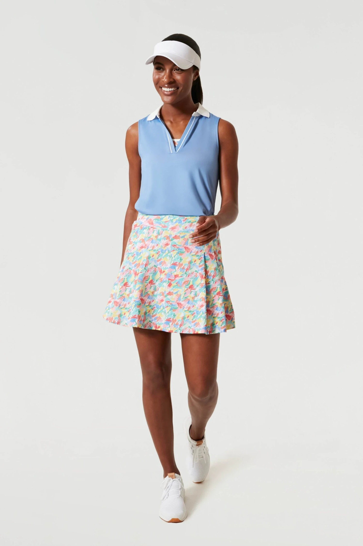 Be ready to take a swing at the Masters in the Sleeveless Caroline Polo. With sweat wicking material and UPF 30 performance, warm days at the course will feel like nothing. Style as a matching set or with a white sport skirt and it’s perfect for any outdoor occasion.Â