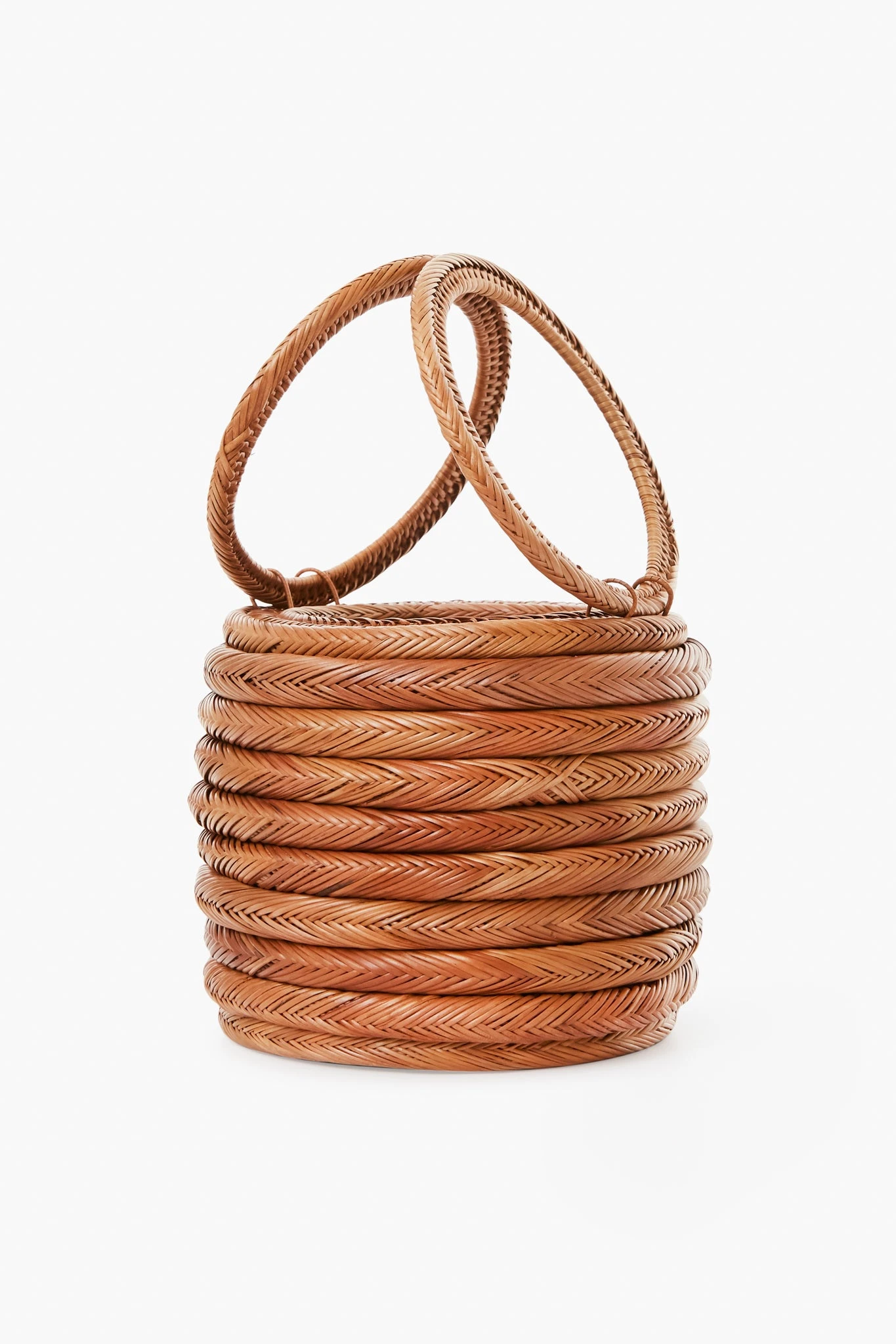 The Natural Yasmina Top Handle is crafted from natural sheen rattan tightly wrapped and shaped into an accordion-style bucket silhouette. Topped with circular handles, this bag is perfect for your essentials. Pair with an elegant dress or caftan for everything from dinner parties to vacation.