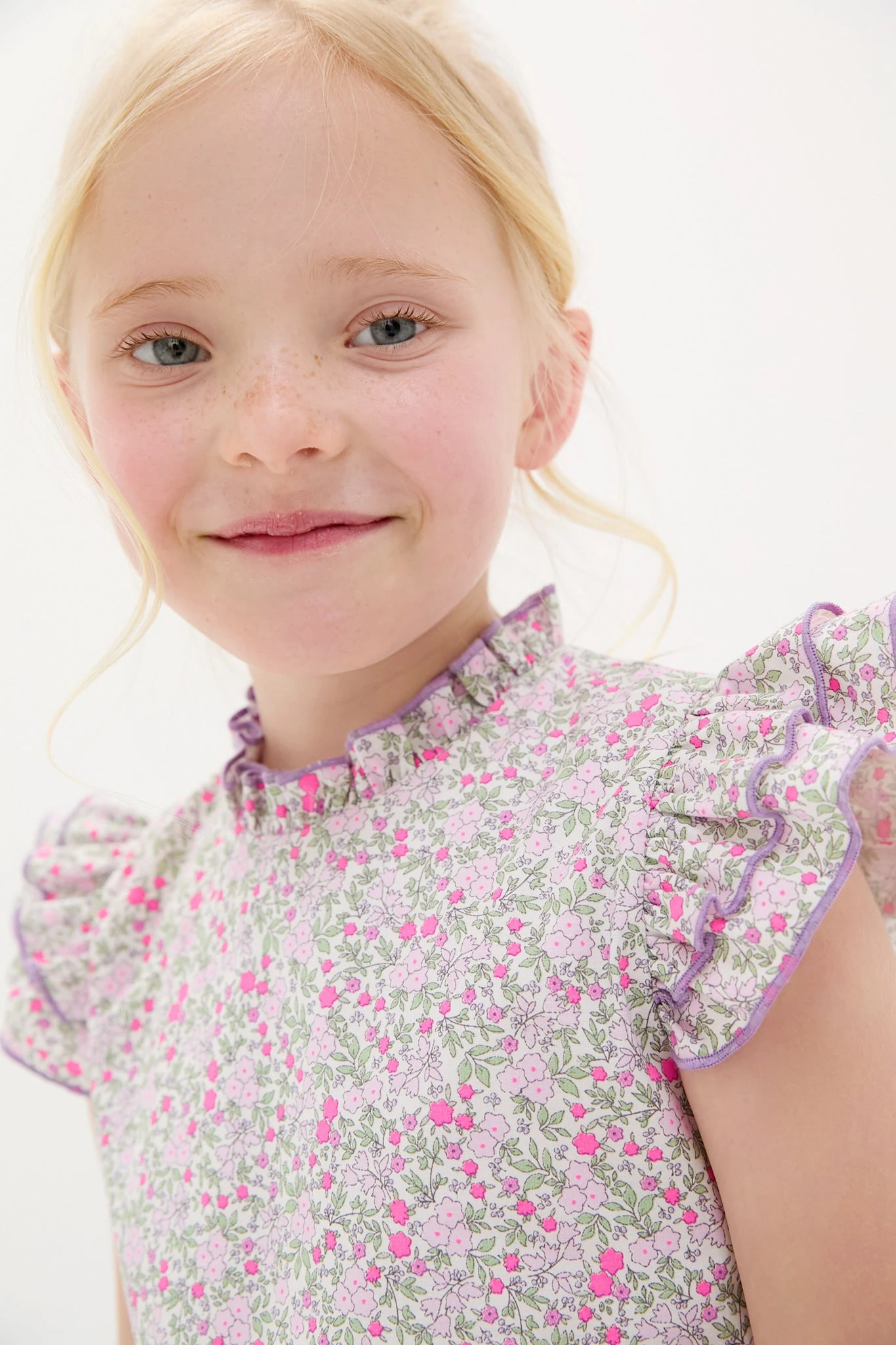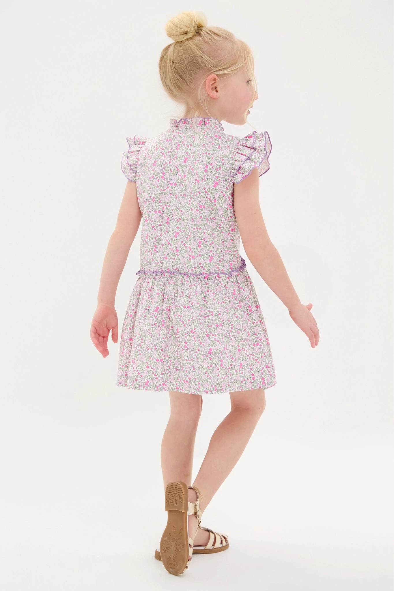 The Fuschia Floral Filomena Dress is beautifully decorated with disty florals in shades of pink, green and purple, and crafted from soft organic cotton poplin with a dropped waist and a softly pleated skirt. With a relaxed, boxy fit, a rounded neckline with a frill finish and tiered butterfly sleeves delicately trimmed with contrasting piped embroidery. The perfect piece for garden parties and special events, it can easily be dressed up or down depending on the occasion.Â