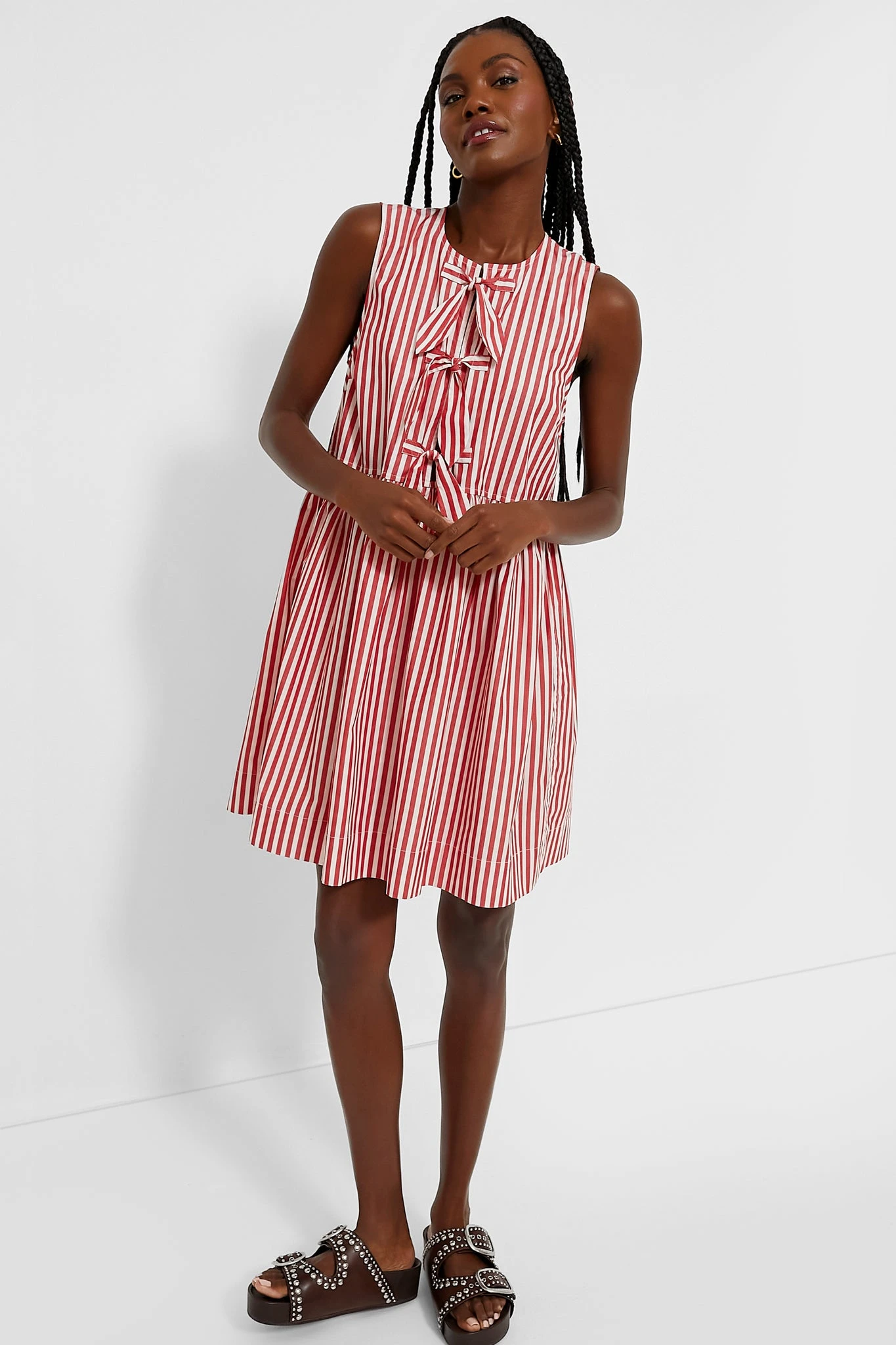 The Barbados Cherry Stripe Cotton Mini Bow Tie Dress is an adorable, playful mini that is perfect for warm-weather activities. This dress has a relaxed fit and features three front bow details and a round neckline. We are pairing it with fisherman styles for a nostalgic look, or with sneakers and a crossbody for casual weekends.