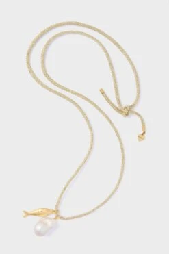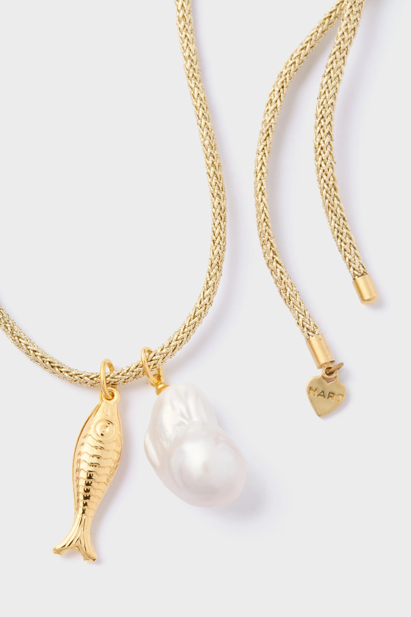 This Gold Lurex Cord Necklace pairs a shimmery thread with a bold baroque pearl and shiny gold fish charm. It’s a little seaside, a little statement, and perfect for adding glow to breezy dresses or casual button-downs. Wear it solo or layer it up for extra shine.