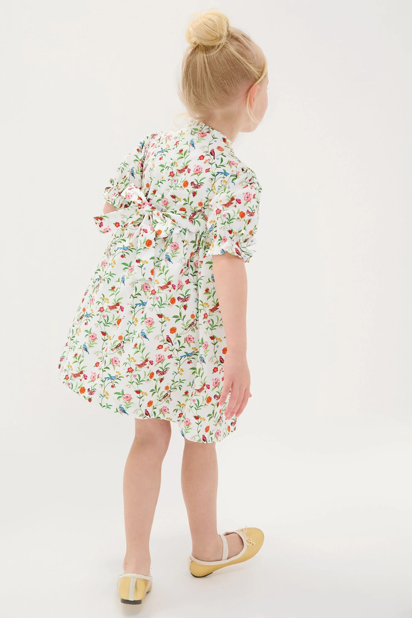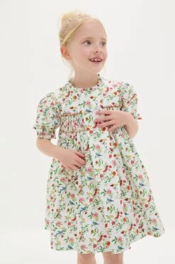 The Ivory Bird Floral Carla Hand-Smocked Girls Dress is a delightful choice for the warm-weather season. With a charming stand collar, pleated trim, and shirred bodice, this dress exudes total elegance. Short puffed sleeves add a voluminous touch, while the longer-length floaty skirt is fully lined for comfort and finished with a self-tie bow at the back. From school events, family functions, and everything in between, this is a dress your little one is sure to love!Â