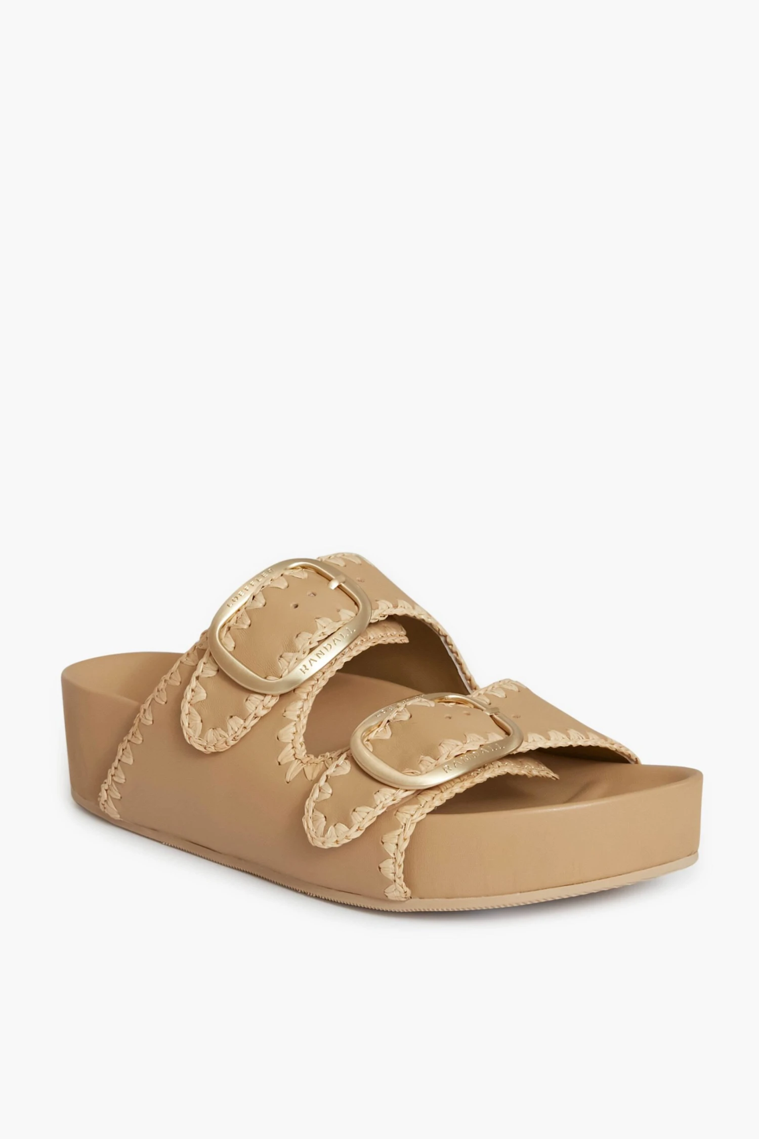 The Theo Sandal is made from bisque Vachetta leather with cream straw embroidery accents. This style features two bands with gold-toned buckles and a padded leather footbed. Throw on with activewear after yoga class or pair with denim shorts and a tee for summer camp carpool.