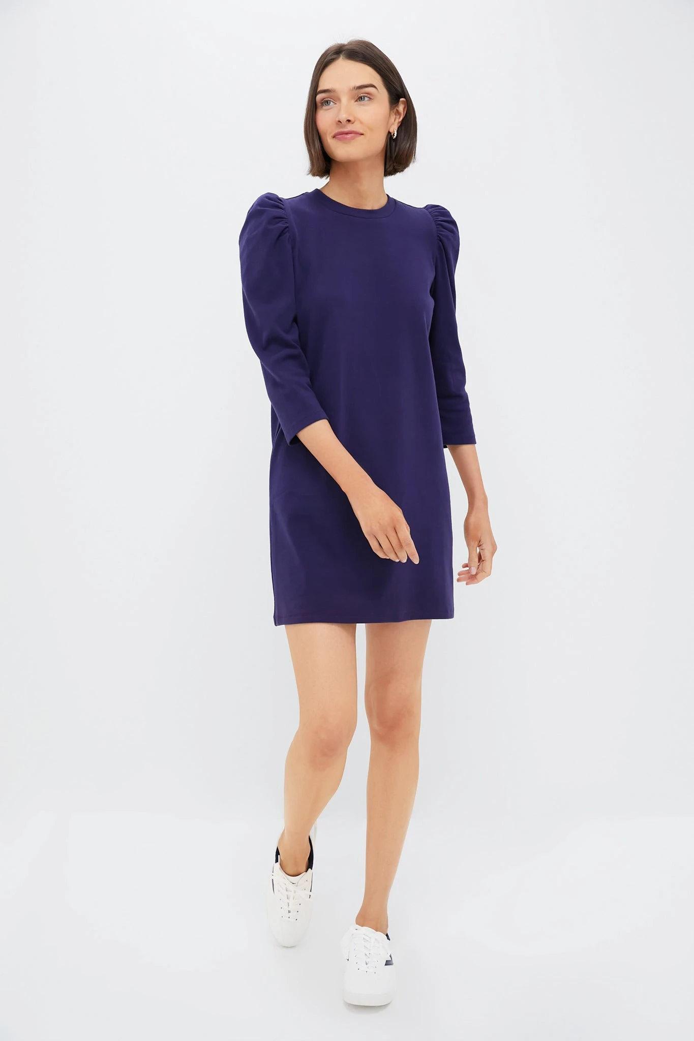 Easy and comfortable yet put-together, the Navy Vesty Dress features quarter length puffed sleeves for some feminine flair, and a classic crew neckline tied together with a flirty and fun mini length. From day to night, this dress pairs seamlessly with everything from flats to sneakers.