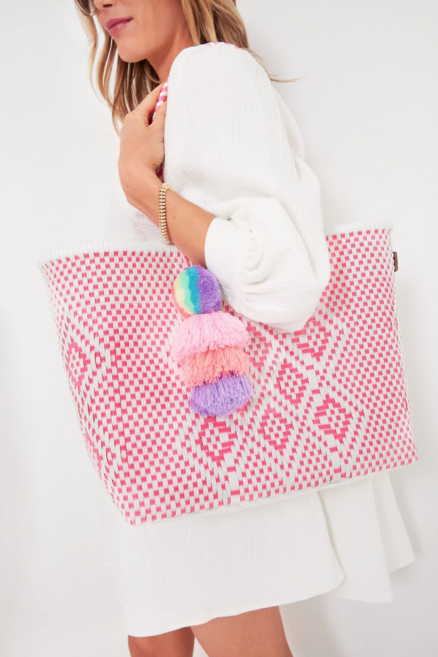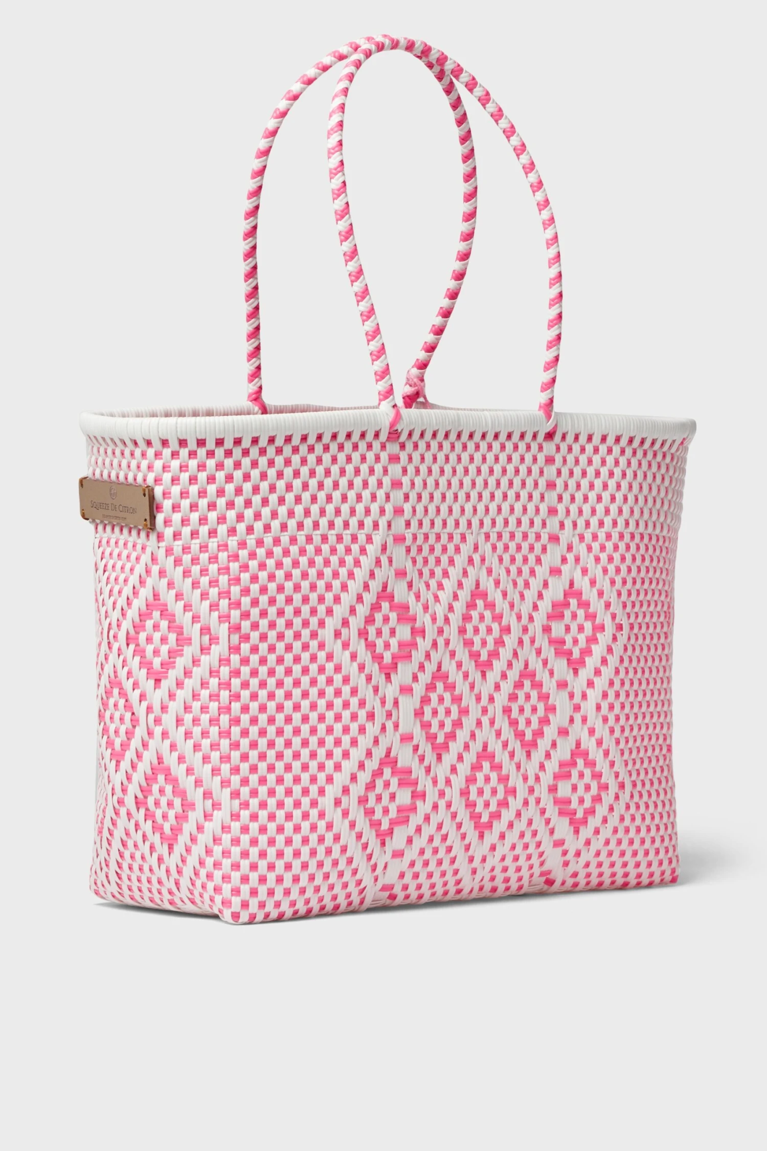 The Neon Pink Cocoles Medium Citron Bag is the definition of true craftsmanship. These totes are ethically made and gracefully sourced by Mexican artisans using Squeeze De Citron’s in house designs. It takes seven to ten days to hand-weave each style from 100% recycled plastic. Not only can you be confident in where your bag comes from, but the feminine and fun pattern and colorful pom are sure to add a joyful touch to your day to day whether you’re headed to the beach or running errands!