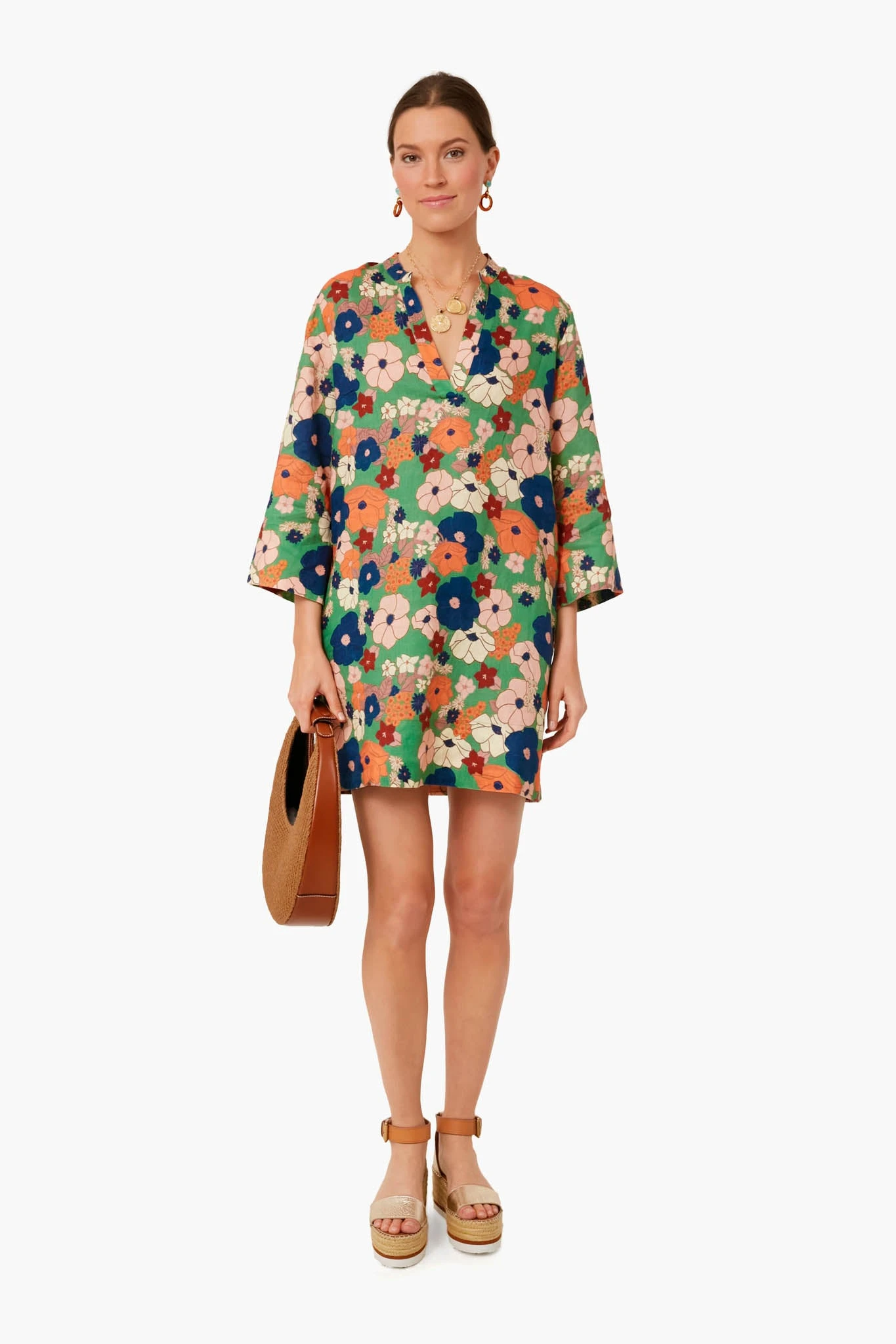 Made from soft linen with a bright floral print, the Pellicano Floral Lucca Shift Dress features long sleeves with a mini tunic silhouette. Feminine and sweet, we are pairing it with raffia accessories and sandals for brunch with friends.