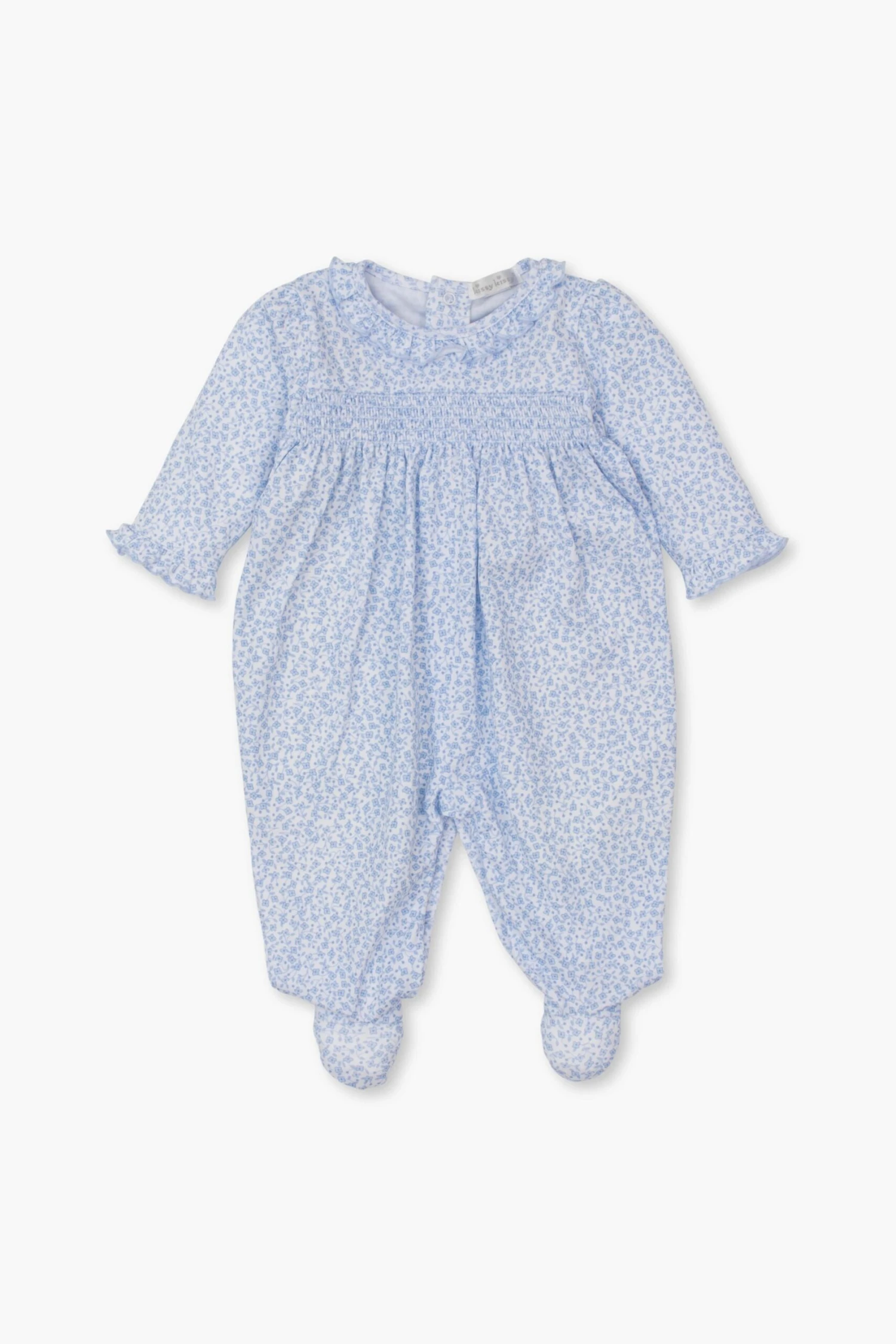 Ultra-sweet and covered in darling ditsy florals, the Petite Blooms Footie is a must-have for your little one! An effortless onesie style with a snap placket at the back for easy changing, this outfit features a ruffled round neckline, a smocked bodice, and adorable little attached feet. From cozying up at bedtime to early morning playtime, this is sure to be a winner.