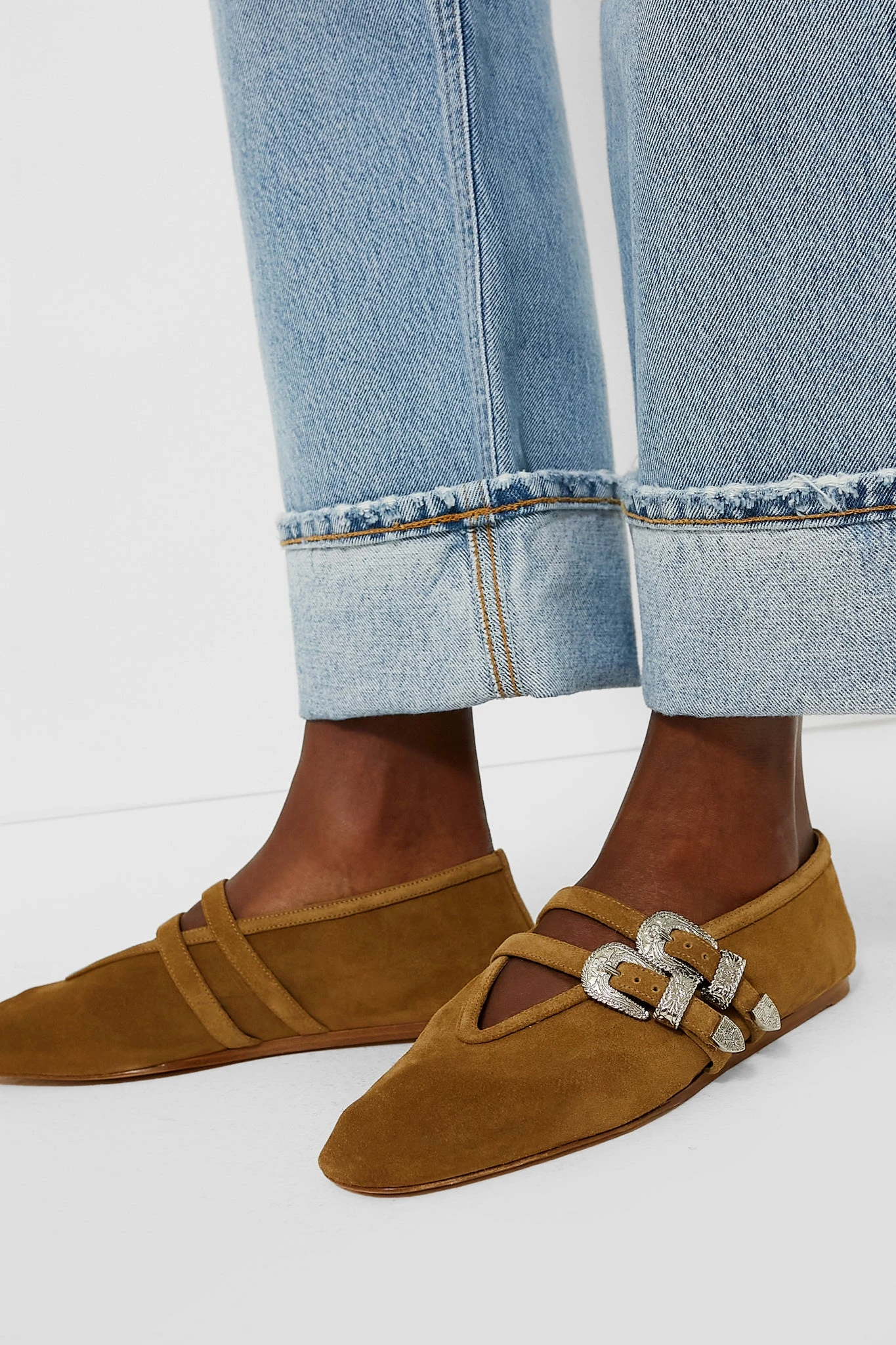 The Taupe Claudia Ballet Slippers blend western-inspired details with a feminine silhouette. This eye-catching style features two adjustable arch straps with buckle closures, a suede body, and leather piping. The perfect way to upgrade your staple closet, these can be paired with denim and a simple blouse or a maxi skirt and belt for a more cowgirl-esque ensemble.Â