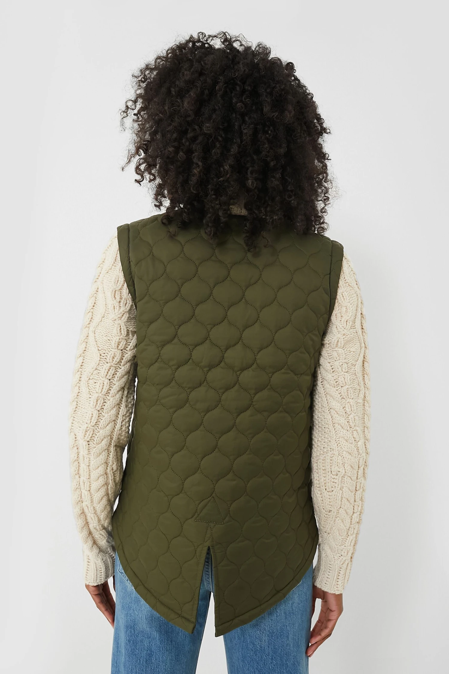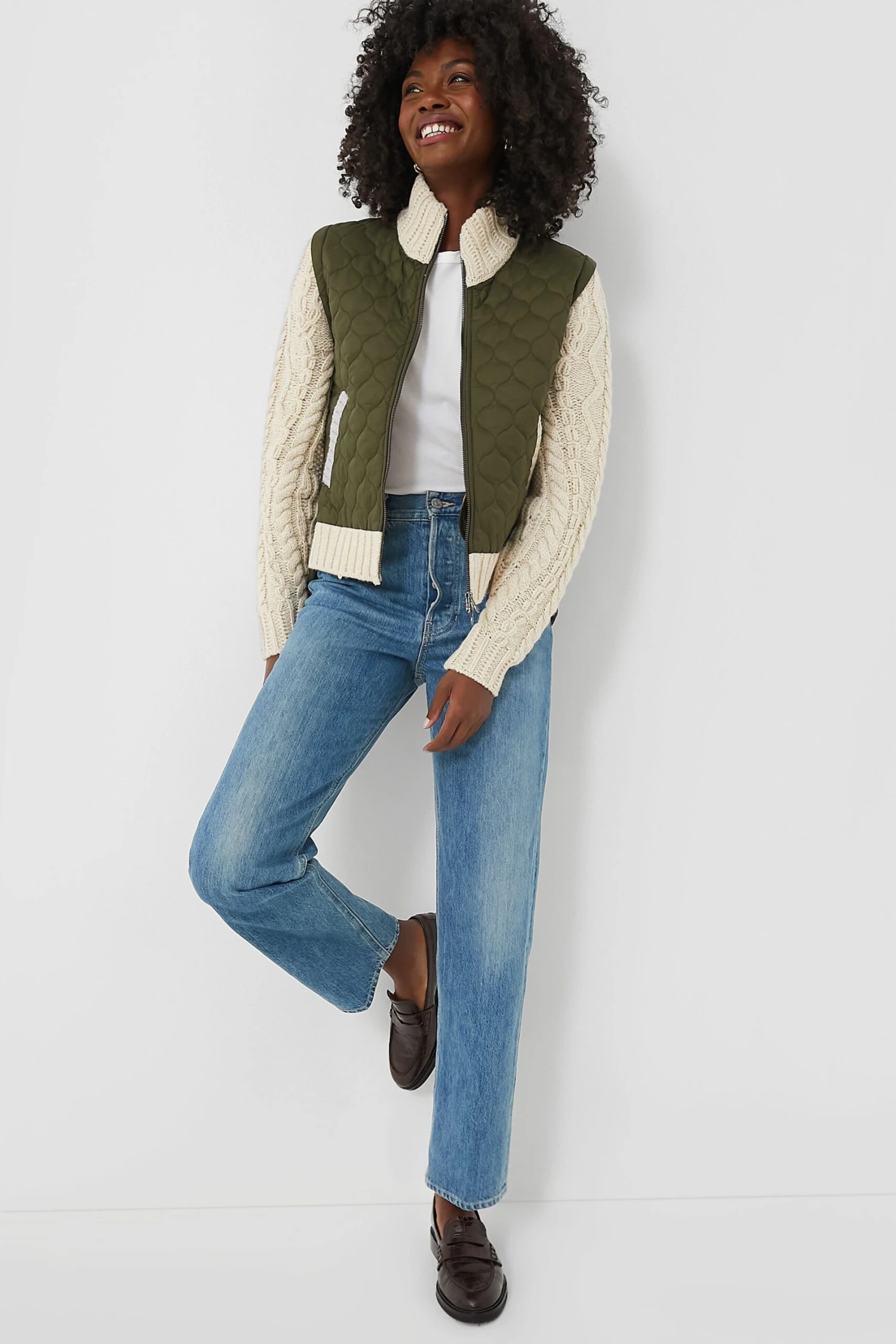 - Mixed media style: quilted vest, cable knit arms