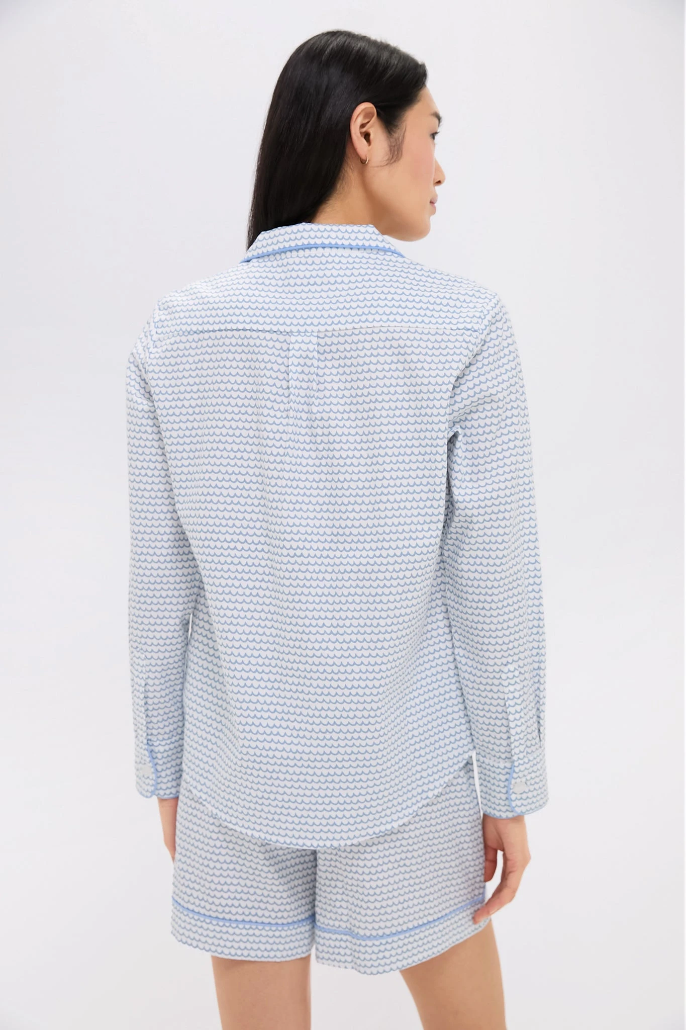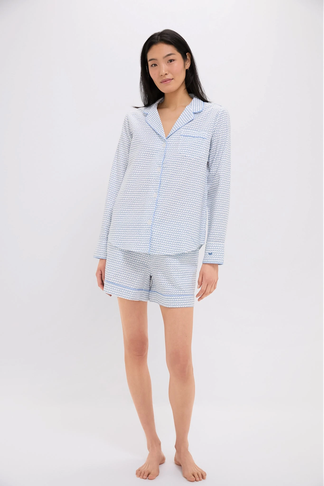 The La Mer Long Sleeve Short Set are adorable and oh-so-classic. These long sleeve pajamas feature a notch collar, front chest pocket, and pattern that reminds us of the ocean. The drawstring shorts allow for perfect fit, and the incredibly soft cotton will make these a sleepwear favorite.Â